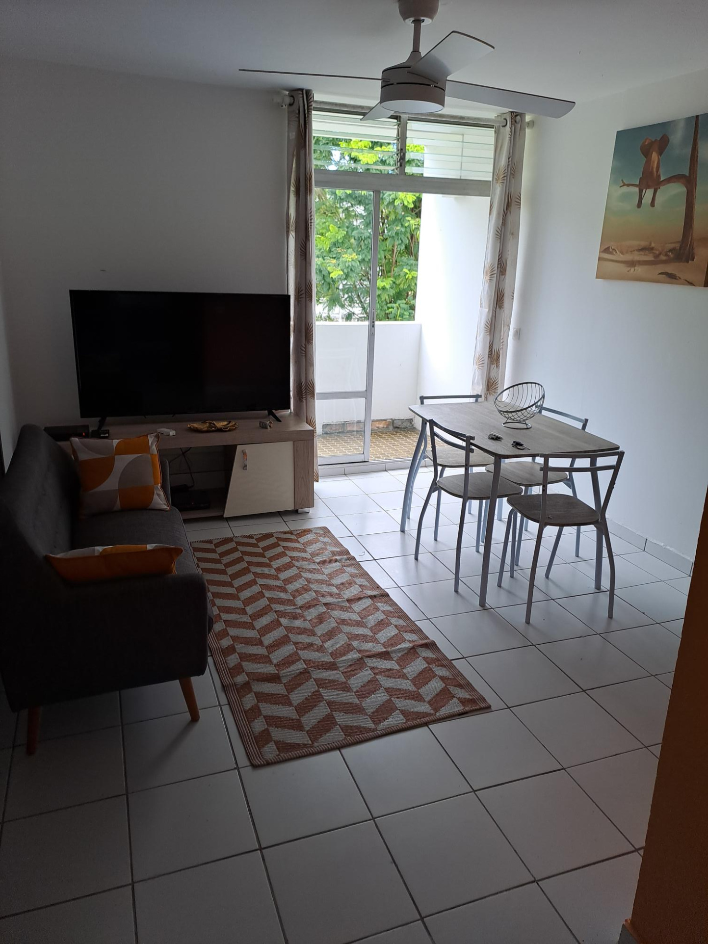un sejour , une terrasse avec kitchenette