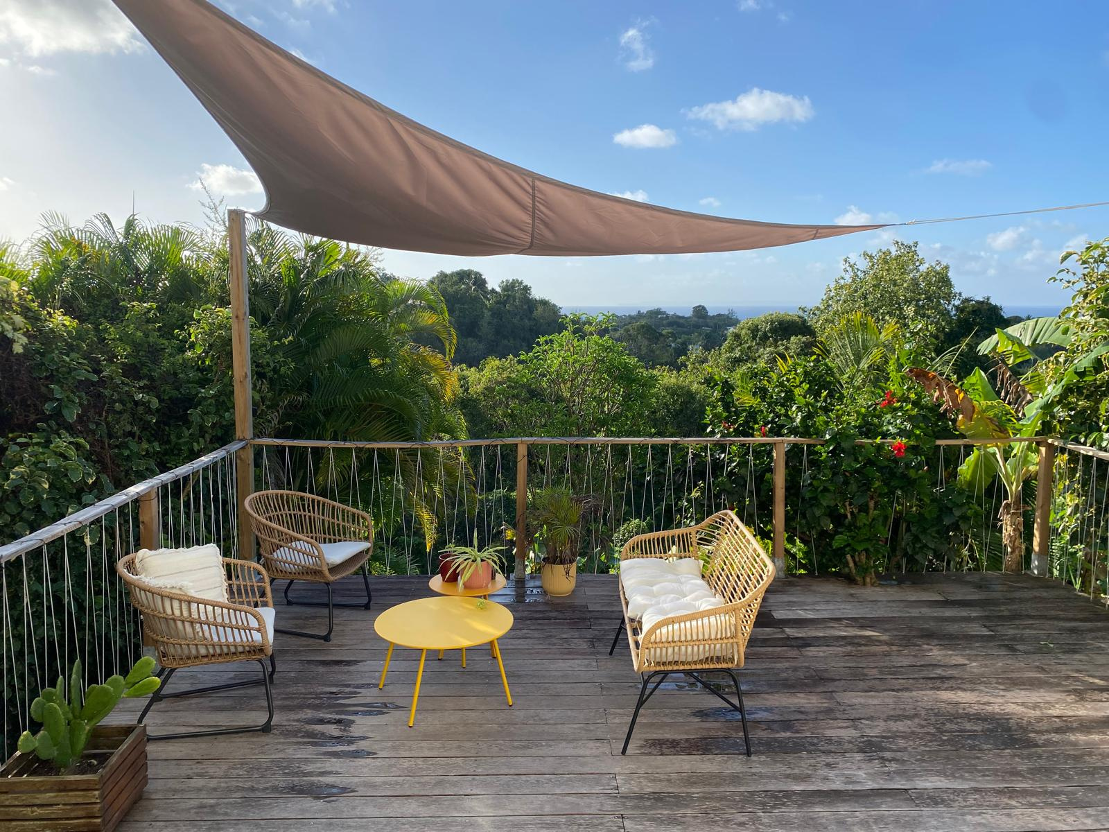 de deux chambres climatisées , une cuisine équipée, un séjour lumineux, une salle d'eau, ainsi qu'une terasse avec un grand deck offrant une vue degagée sur la nature et une vue mer.