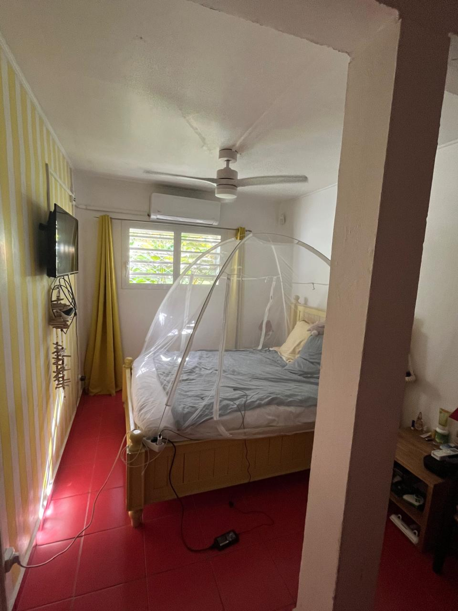 Une chambre climatisée avec placard, téléviseur au mur.