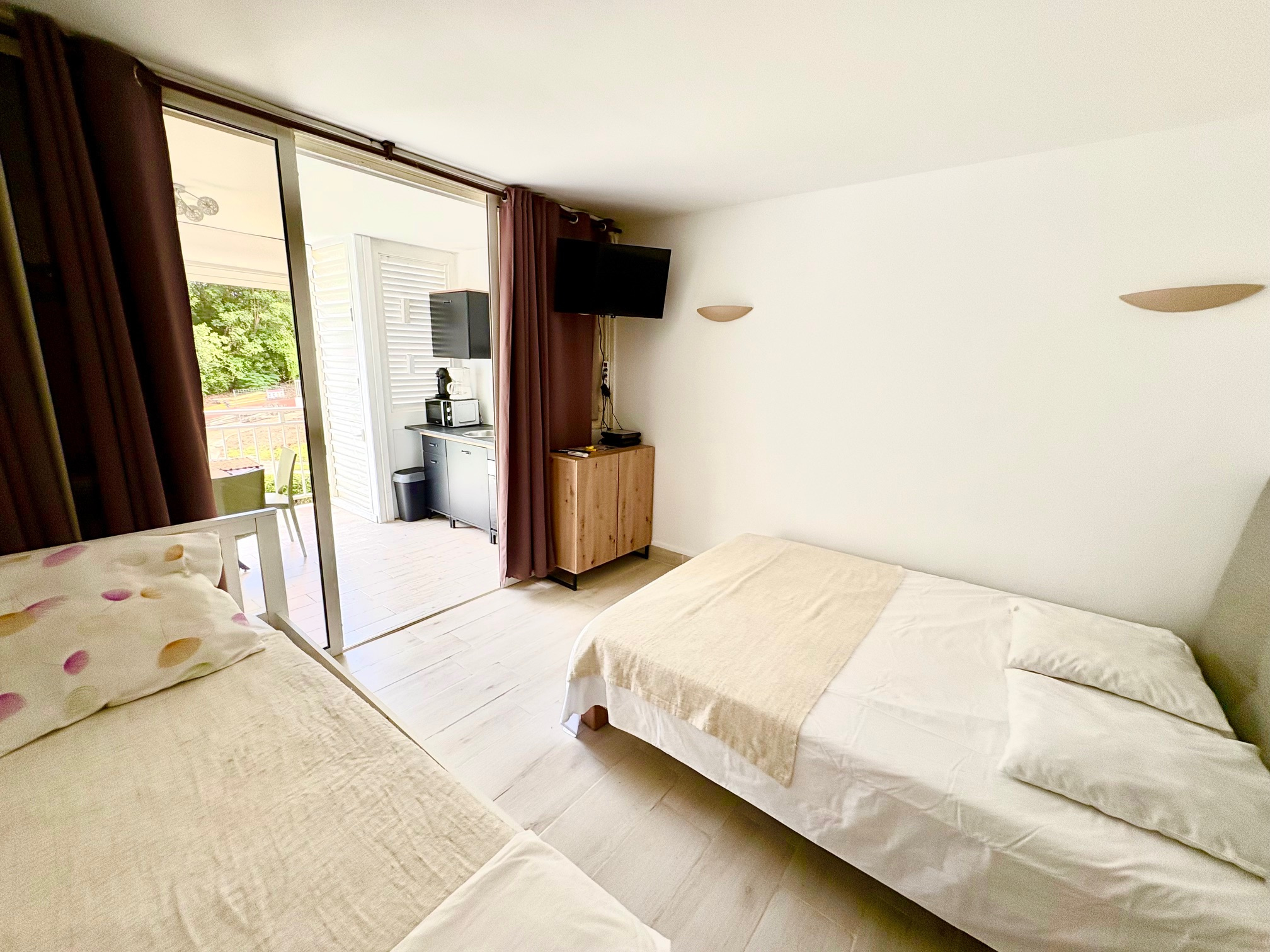 ANSE DES ROCHERS : T2 VUE MER ET PISCINE en étage meublé de 29 m2 (terrasse comprise) avec accès direct à la plage, piscine et tennis. La résidence est sécurisée avec parking, gardien et restaurant. Appartement composé d'une entrée avec placard, 1 grande salle d'eau avec douche,WC et lave-linge, 1 chambre climatisée équipée pour 4 personnes, 1 cuisine équipée avec coin repas sur la terrasse fermée par volet roulant électrique et clayettes. Résidence sécurisée avec parc arboré et paking. Pour plus d’informations contacter Laurence CAILLET par WHATSAPP et SMS au +590 690 002 312 ou par SMS au 0690 35 97 18 et par mail : laurence@immo971.com et/ou cailletlo971@gmail.com en laissant vos coordonnées et l'objet de votre appel.
