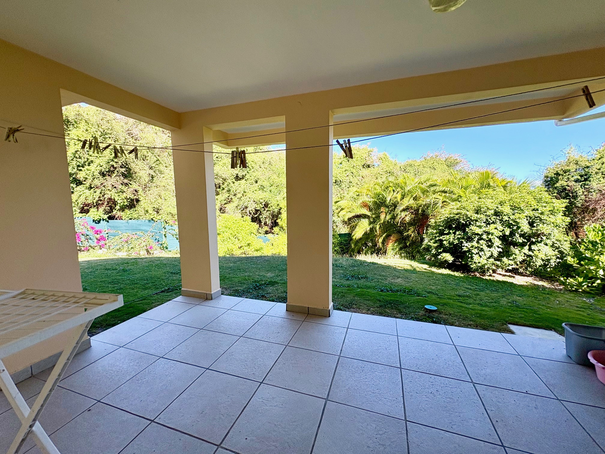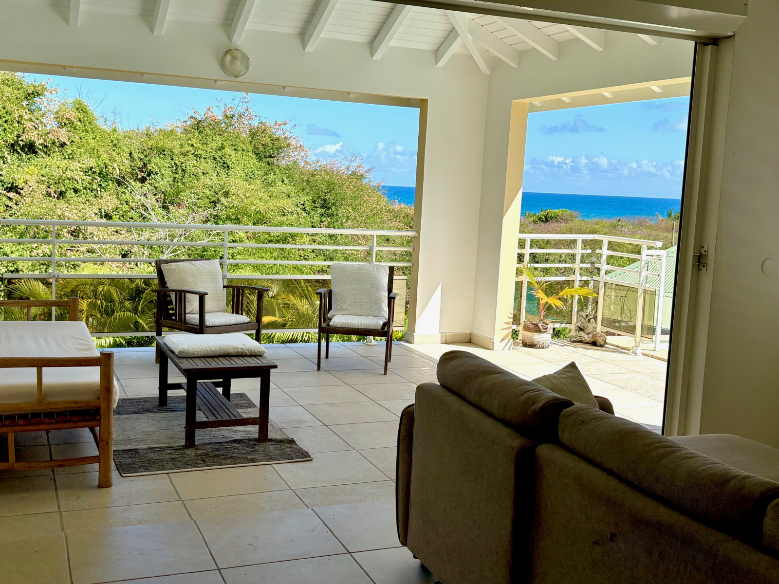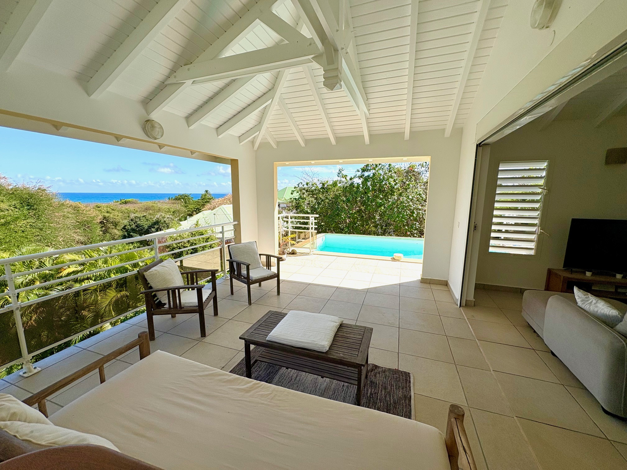 PLEINE VUE MER depuis le salon, la terrasse et la piscine de la villa duplex contemporaine de type F3 de 123 m2 (terrasses comprises) située dans un quartier très recherché et résidentiel proche de la plage accessible à pied. Composée à l'étage d'un vaste salon avec charpente cathédrale, 1 cuisine US équipée avec passe-plat vers la terrasse, 1 salle d'eau/WC "PMR", 1 terrasse avec vue degagée et vue mer prolongée par 1 plage carrelée et la piscine. Au niveau R-1,un large dégagement dessert les 2 belles chambres climatisées donnant chacune sur 1 galerie ombragée en rez de jardin, 1 salle d'eau, 1 grand WC séparé. Un local technique piscine complété d'un coin buanderie permet de stocker les objets encombrants. Le jardin est clos 670m2 env avec végétation tropicale. Citerne tampon. Parking 2 places mini. Pour plus d’informations contacter Laurence CAILLET par WHATSAPP et SMS au +590 690 002 312 ou par SMS au 0690 35 97 18 et par mail : laurence@immo971.com et/ou cailletlo971@gmail.com en laissant vos coordonnées et l'objet de votre appel.