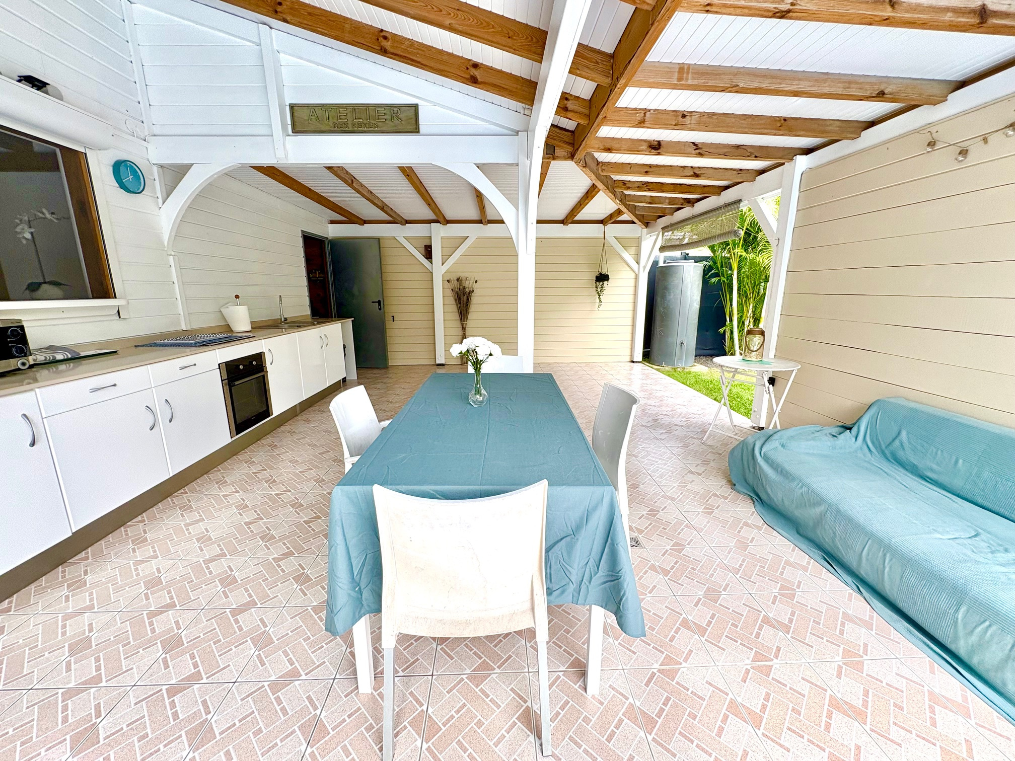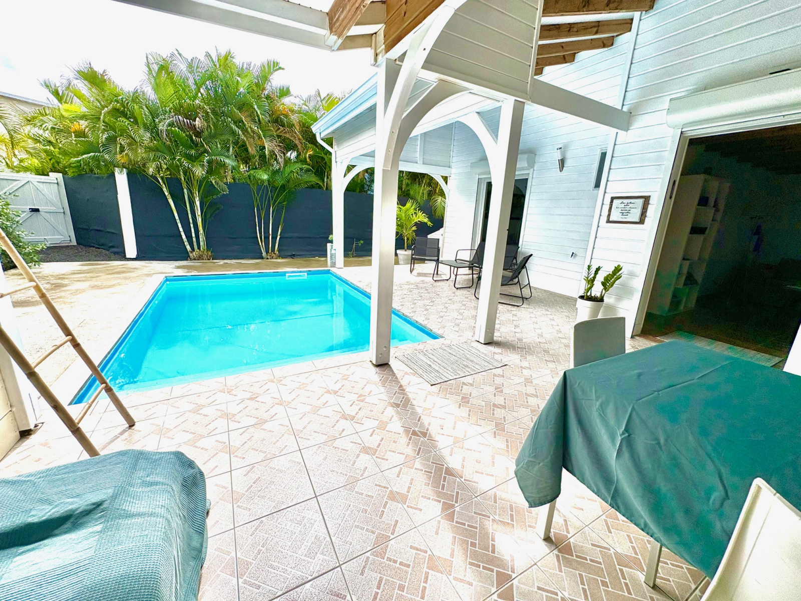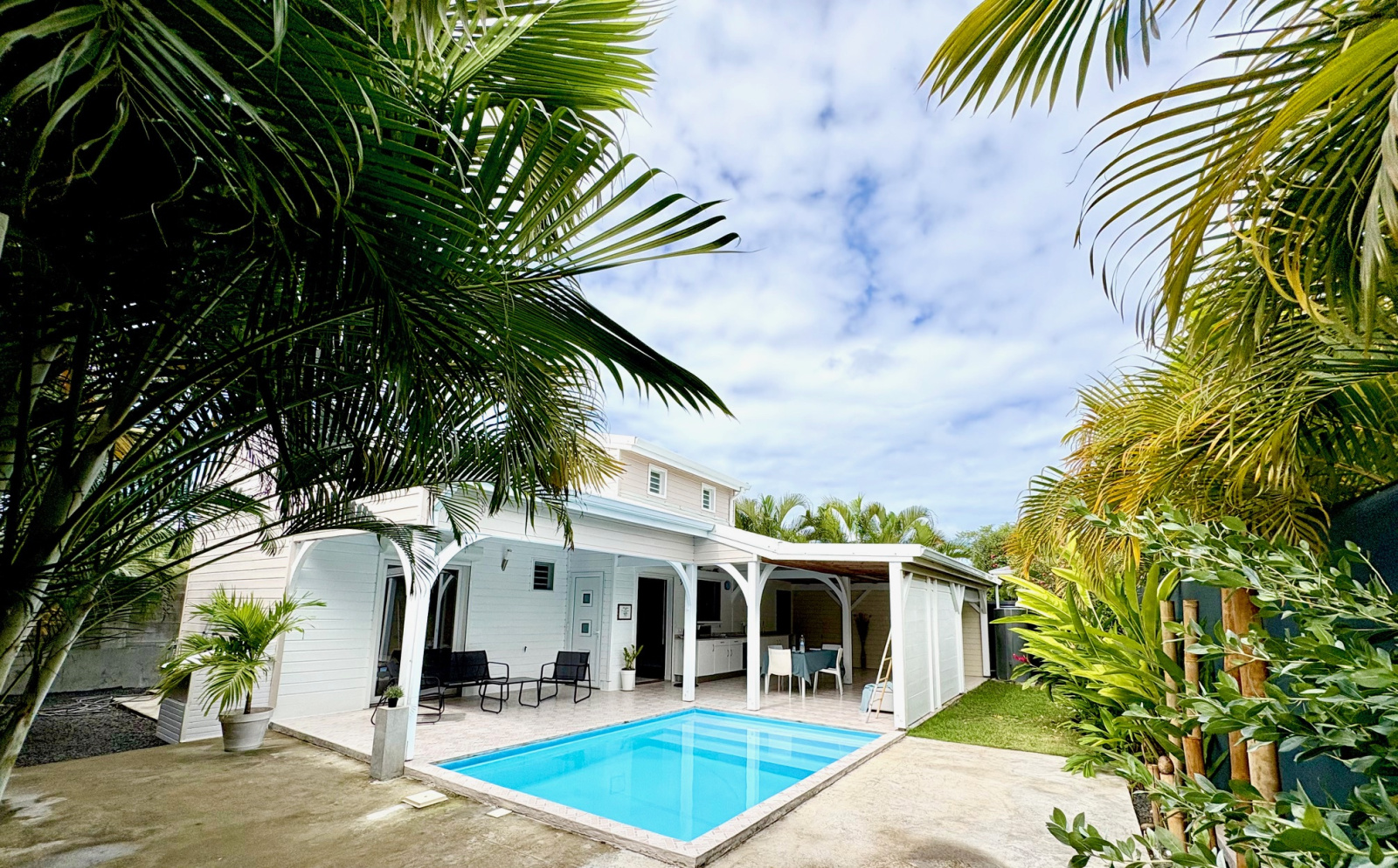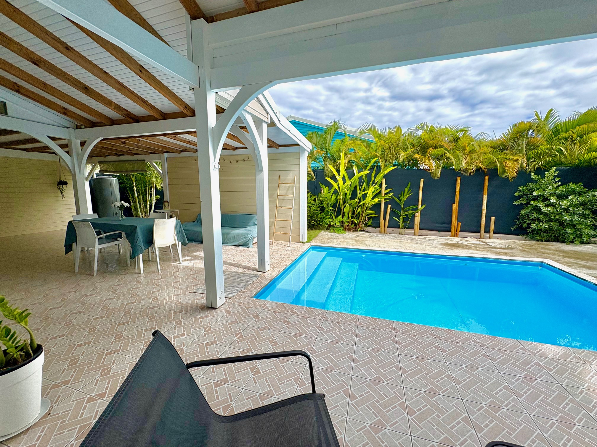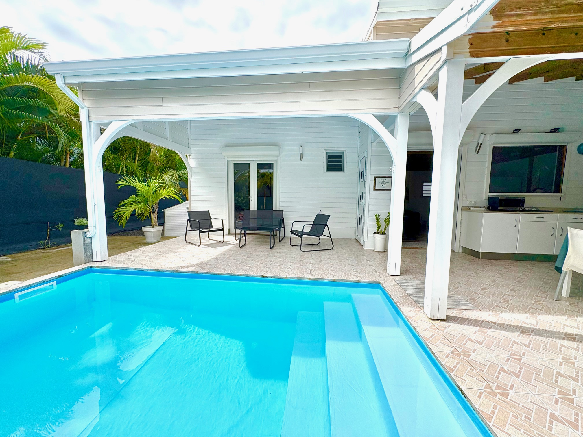 Maison F3/4 meublée et équipée d'une surface totale d'env. 119 m2 (terrasse comprise), nichée dans 1 petit jardin tropical intimiste à seulement 2 km de la plage des Raisins Clairs et du collège. Composée de 1 salon, 2 chambres climatisées avec rangement, 1 salle d'eau, 1 WC séparé, 1 grande terrasse d'env. 55m2 avec cuisine US équipée et agencée, pièce convivale avec son coin repas et son salon extérieur, 1 pièce débarras/buanderie d'env. 16m2, 1 piscine, 1 citerne bac tampon, 1 CE solaire. Jardin clos d'env. 270 m2. Place de parking. Idéal pour un pied à terre en Guadeloupe ou pour revenus locatifs touristiques et/ou longue durée. Pour plus d’informations contacter Laurence CAILLET par WHATSAPP et SMS au +590 690 002 312 ou par SMS au 0690 35 97 18 et par mail : laurence@immo971.com et/ou cailletlo971@gmail.com en laissant vos coordonnées et l'objet de votre appel.