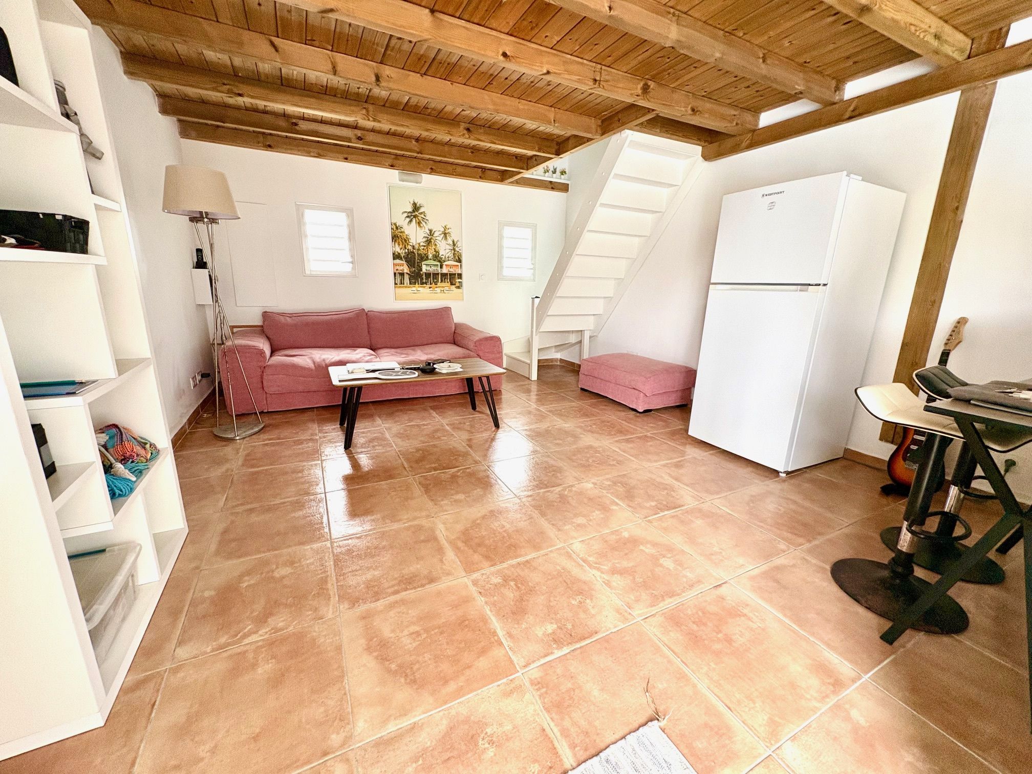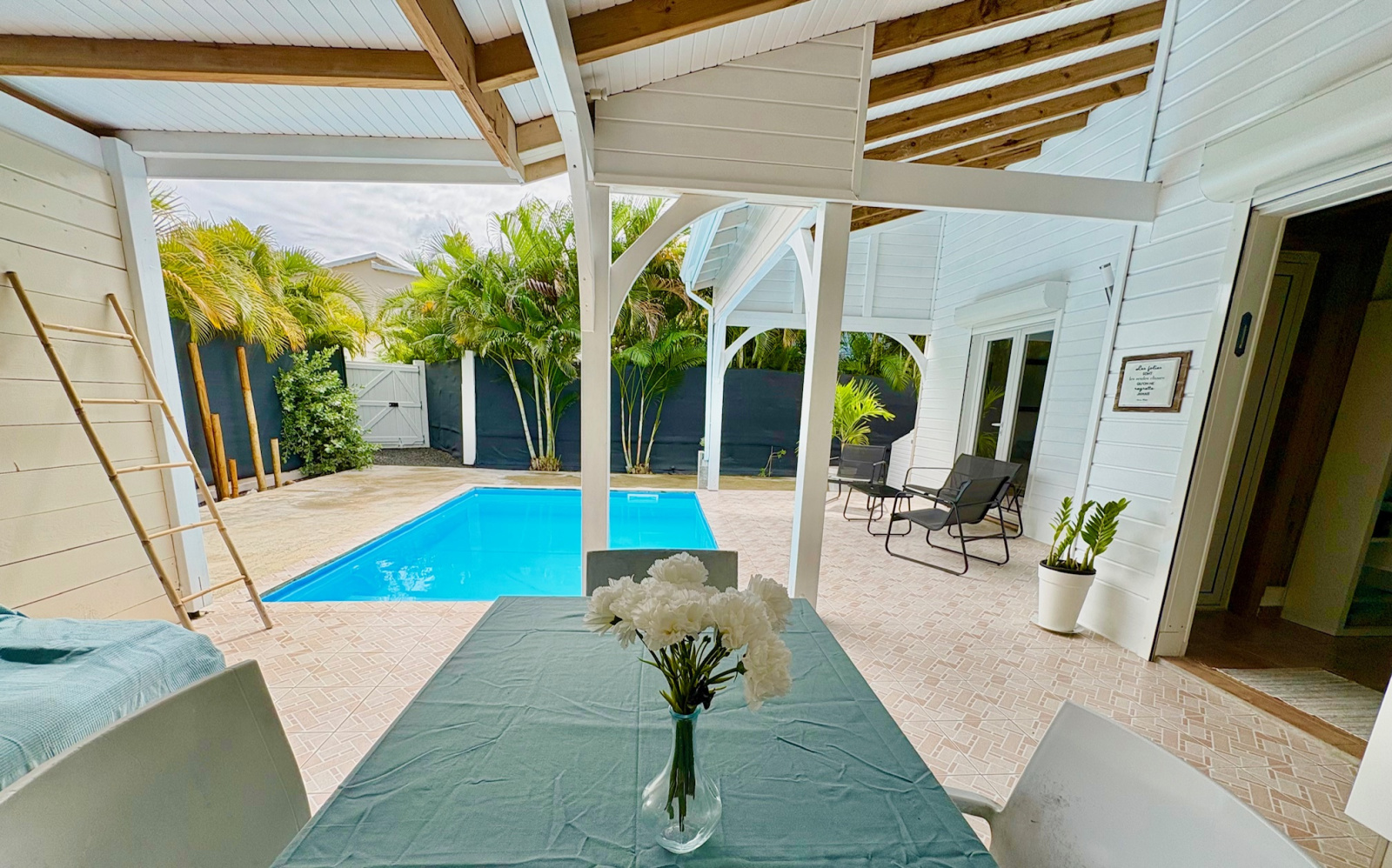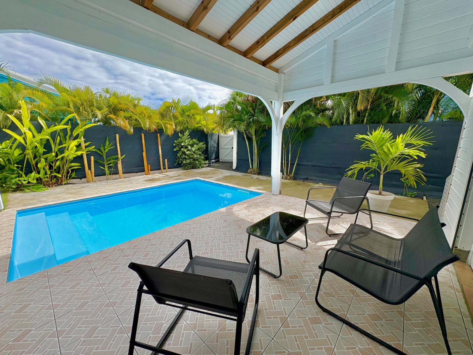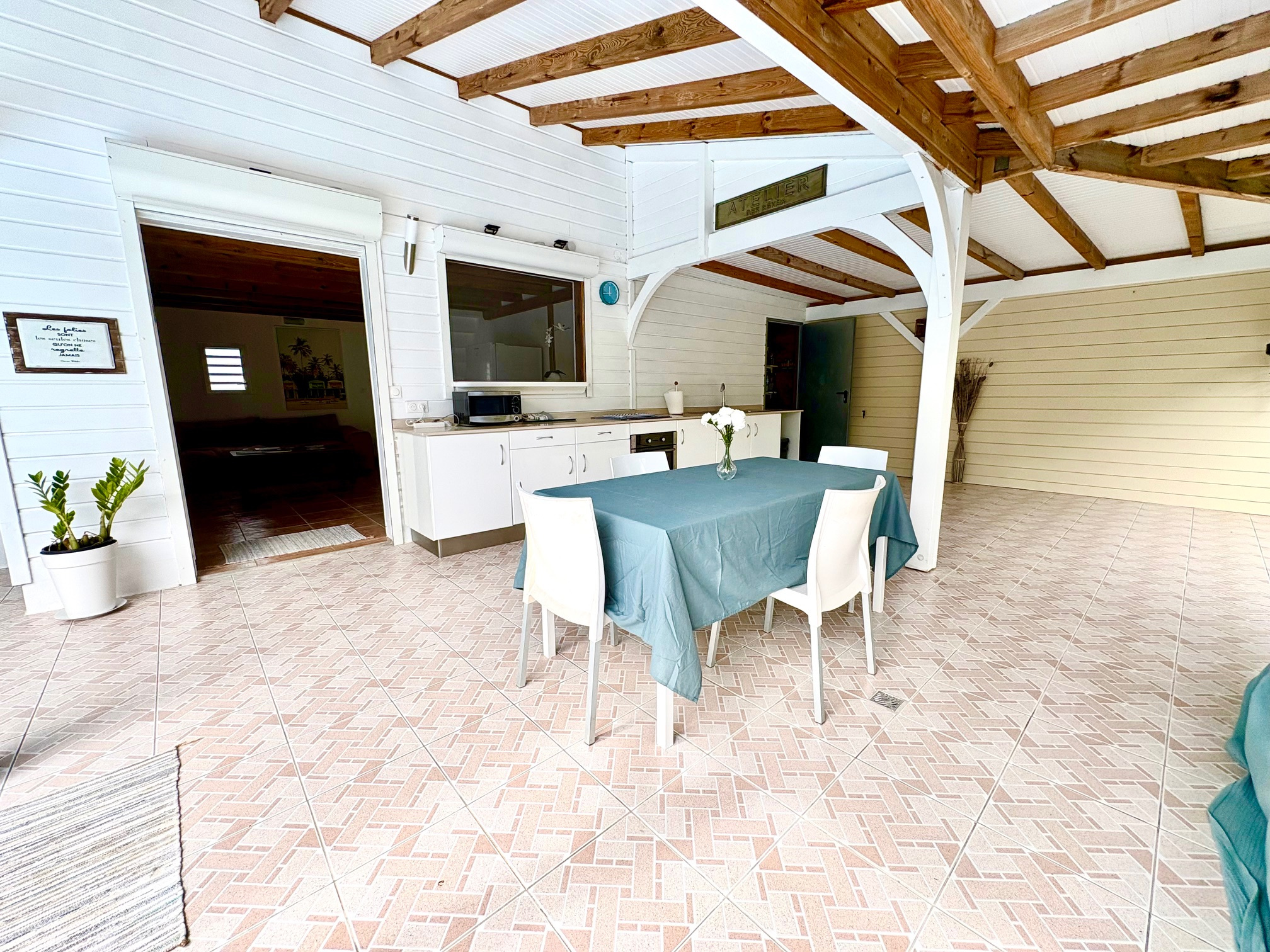 Maison F3/4 meublée et équipée d'une surface totale d'env. 119 m2 (terrasse comprise), nichée dans 1 petit jardin tropical intimiste à seulement 2 km de la plage des Raisins Clairs et du collège. Composée de 1 salon, 2 chambres climatisées avec rangement, 1 salle d'eau, 1 WC séparé, 1 grande terrasse d'env. 55m2 avec cuisine US équipée et agencée, pièce convivale avec son coin repas et son salon extérieur, 1 pièce débarras/buanderie d'env. 16m2, 1 piscine, 1 citerne bac tampon, 1 CE solaire. Jardin clos d'env. 270 m2. Place de parking. Idéal pour un pied à terre en Guadeloupe ou pour revenus locatifs touristiques et/ou longue durée. Pour plus d’informations contacter Laurence CAILLET par WHATSAPP et SMS au +590 690 002 312 ou par SMS au 0690 35 97 18 et par mail : laurence@immo971.com et/ou cailletlo971@gmail.com en laissant vos coordonnées et l'objet de votre appel.