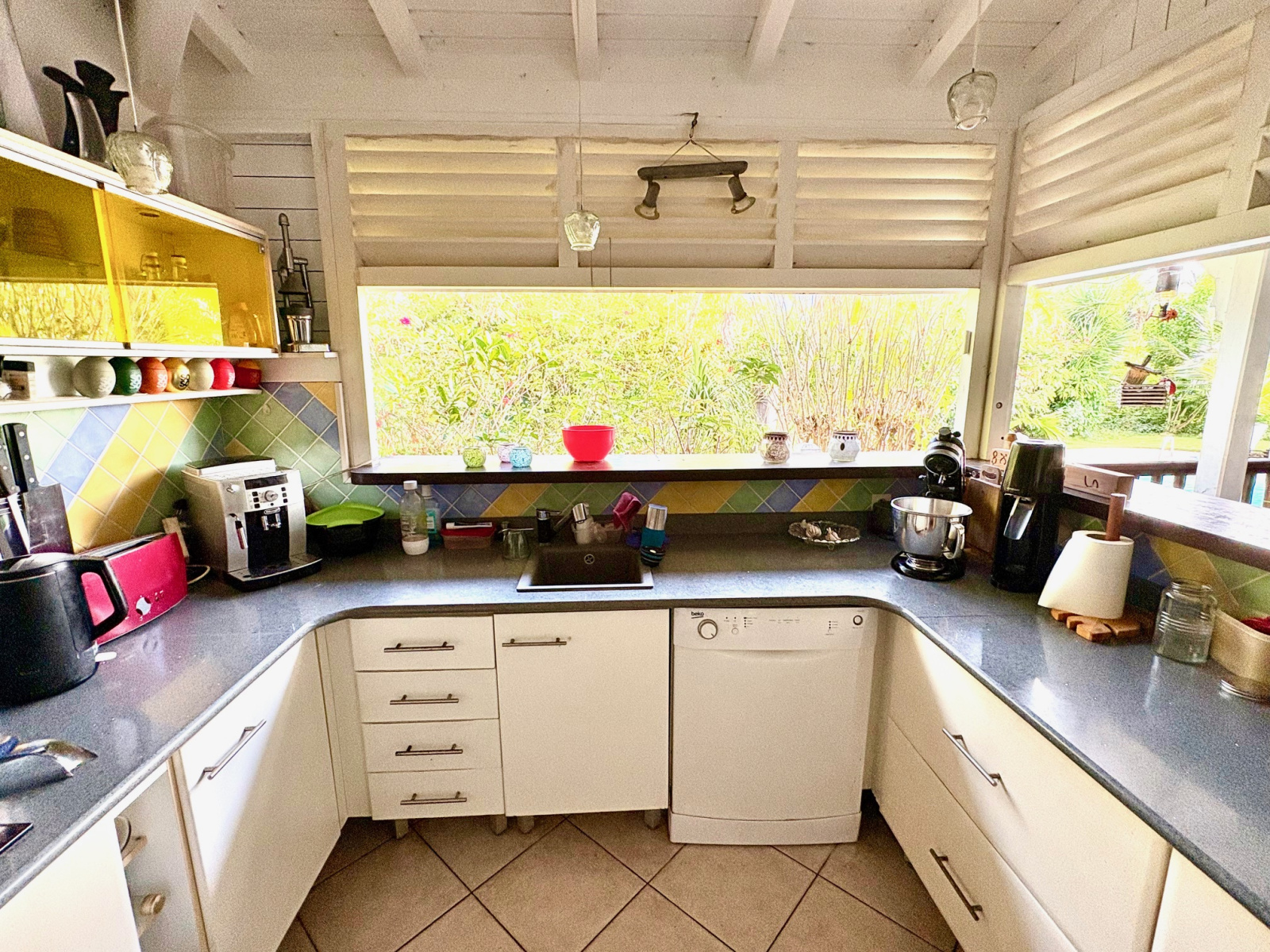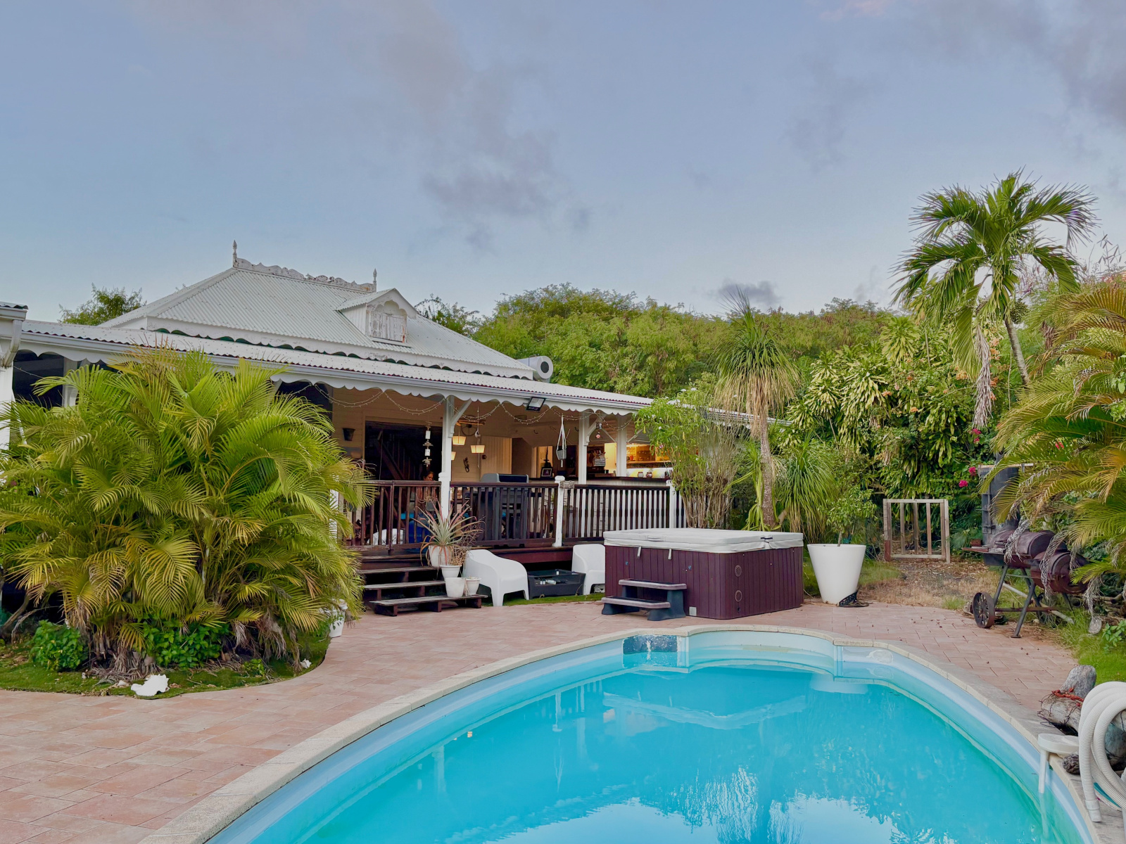 Propriété dans quartier résidentiel très recherché, composée d'une villa (2 chambres, 1 mezz, 1 cuisine, 1 salon, 1 sd'eau, 1 SDB, 2 WC) et bungalow (1 chambre, 1 mezz, 1 sd'eau/WC, 1 cuisine/terrasse), 1 vaste terrasse traversante naturellement aérée d'env. 50 m2 relie les 2 unités, aménagée avec espace salon, 2 espaces salle-à-manger, espace bureau. Les 2 unités sont réalisées dans la tradition créole typique des Caraïbes, avec des matériaux de référence tel que du bois rouge. Implantées sur une belle parcelle d'env. 1000 m2 agrémentée d'une piscine (9 m de long), 1 unité inachevée d'env. 19m2 qui offre diff. options : bungalow suppl., atelier, cabinet bien-être, etc...Citernes tampon et d'eau de pluie. Résidence proche de la Marina, du golf et des plages : 3 min. en voiture. Le jacuzzi (visible sur photo) sera retiré. Pour plus d’informations contacter Laurence CAILLET par WHATSAPP et SMS au +590 690 002 312 ou par SMS au 0690 35 97 18 et par mail : laurence@immo971.com et/ou cailletlo971@gmail.com en laissant vos coordonnées et l'objet de votre appel.